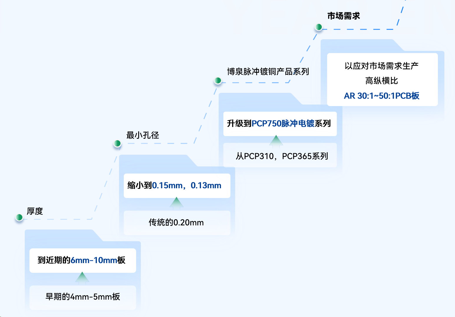 在稳定发展通用脉冲镀铜技术的同时,今年以来,博泉化学还在高纵横比(AR20:1以上)脉冲镀铜技术上持续发力,继年初在深南电路取得规模化应用而获得其颁发的“联合创新奖”(点击查看)后,又在多家头部PCB制造企业与国外竞争对手展开角力,拿下多条产线,另在多家企业进入最终打板阶段。PCP750系列产品在AR 25/40:1高纵横比板的可靠性测试中,镀层延展性、抗拉强度、热应力测试等表现优异。随着AI服务器、传统服务器、智能车用PCB领域的高速发展,高端PCB制造产业势头强劲,博泉化学高纵横比脉冲镀铜技术正在加速普及。