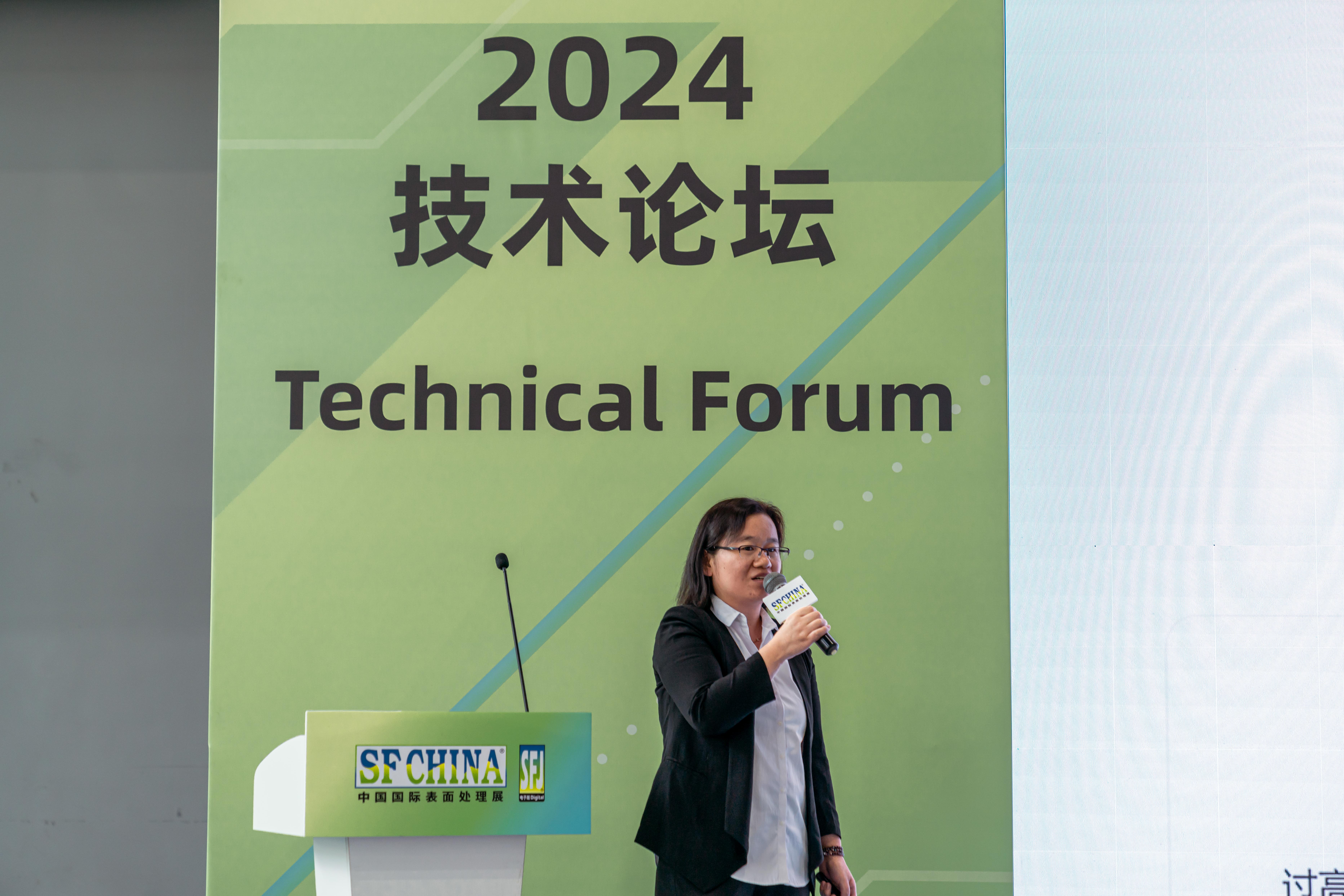 展会期间,k8凯发官网入口研究院前后处理研究室主任,高级工程师刘宁华出席“芯片电镀链-聚焦高端电镀技术新发展”论坛,带来了一场精彩的主题演讲——“亲水钝化技术在芯片散热管理中的研究及应用”。她以独到的见解和详实的数据,深入剖析了亲水钝化技术将如何通过改善基材的表面性质,加快冷却剂的流动,为芯片散热效率带来显著提升,同时延长了设备的使用寿命。