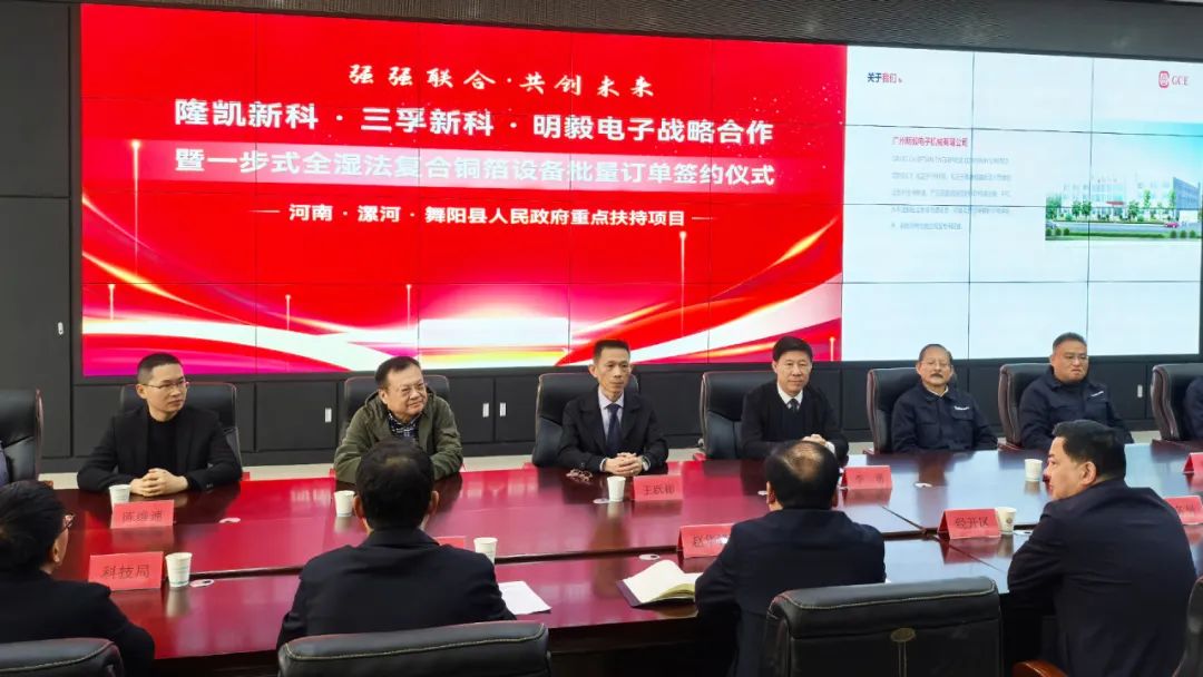 3月31日,在河南省漯河市,隆凯新材料科技(河南)有限公司、广州k8凯发官网入口新材料科技股份有限公司、广州明毅电子机械有限公司,正式签署三方战略合作协议,并完成首批一步式全湿法复合铜箔设备订单签约。在漯河市舞阳县委常委、常务副县长赵华峰的带领下,县政府、经开区、商务局、科技局、闽东南招商服务中心的主要负责人,与三方企业高层齐聚一堂,共同见证签约仪式的圆满举行。签约仪式由隆凯新科董事长王跃彬,k8凯发官网入口新科董事、副总经理陈维速,明毅电子总经理邓高荣共同完成。此举标志着三方深度合作正式拉开序幕,共同开启新能源锂电池行业创新与发展的新篇章。